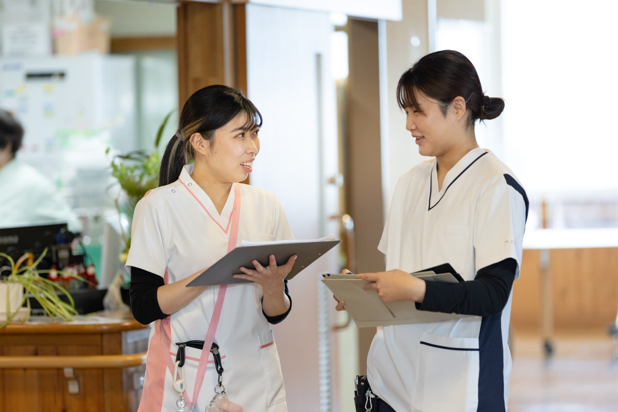 塩尻ICからのアクセスもよく、木目調で落ち着いた雰囲気の病院です。多職種での事例検討会など、職員全体の顔が見える規模感で連携がとりやすいのが魅力です。松本協立病院配属の同期とともに受講する研修に加え、塩尻協立病院独自の研修も行っており、丁寧なサポートを受けながら成長することができます。